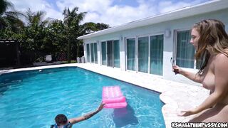 Busty teen relaxes naked in her pool