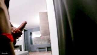 Exhibitionist adventure in a bisex restroom of a swimming pool. I go around with erected cock and I flash two whores. Naked session under the shower with both of them. Caught masturbating and totaly exposed cock