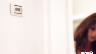 Roberta Gemma is a sexy and prosperous maid who, while doing her job in a luxurious and beautiful house, excites the landlord, a boy who is playing with a video game that just can't resist his firm ass and huge breast and she closes in the bathroom to masturbate.So while she touches herself, she dreams of getting a good blowjob from her, to fuck her on the sofa and to possess her in that hot ass while she screams with pleasure.When she cums in the bathroom alone, Roberta arrives and bows in front of him, he begins to lick the cum on his hands and take his cock in his mouth ... but this time it's not a dream!