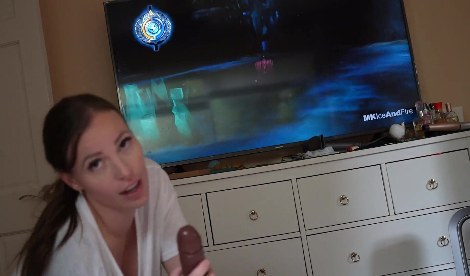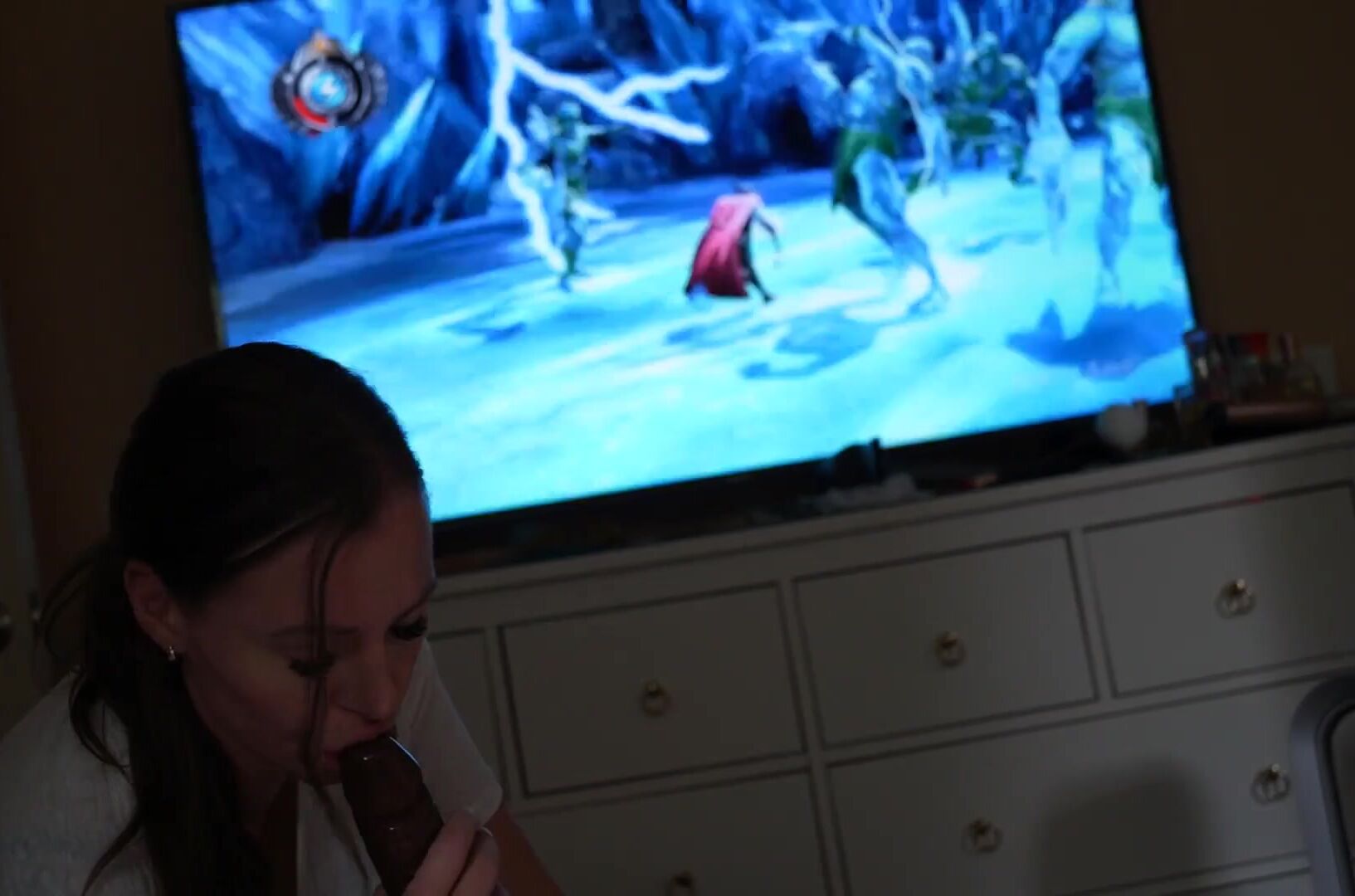 Son playing video games. Mommy comes in and decides she wants to play with sons peepee. Mommy acts like it's normal and continues normal conversation while loving her sons peepee.